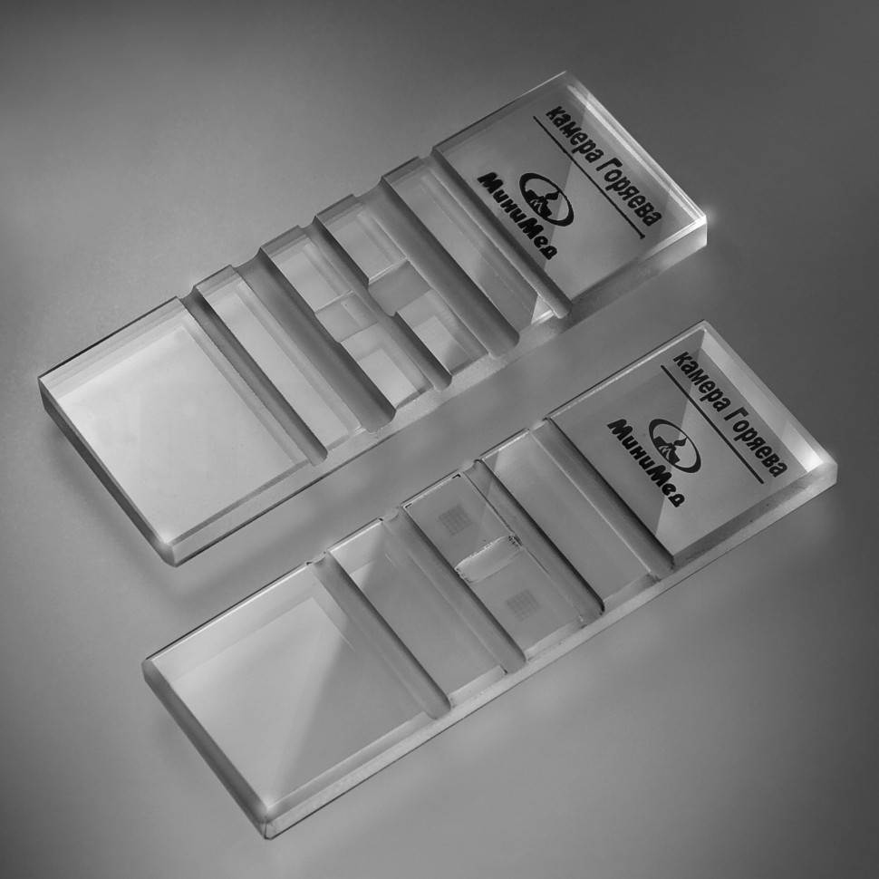 Площадка камеры, расположенная посередине, разделяется на две, каждая имеет сетку Горяева, нанесенную гравировкой. С обеих сторон находятся две другие - они предназначены для притирания покровного стекла. После притирания такого стекла создается камера типа Горяева. С двух сторон она закрыта, а с пары других - оставлены щели для заполнения.